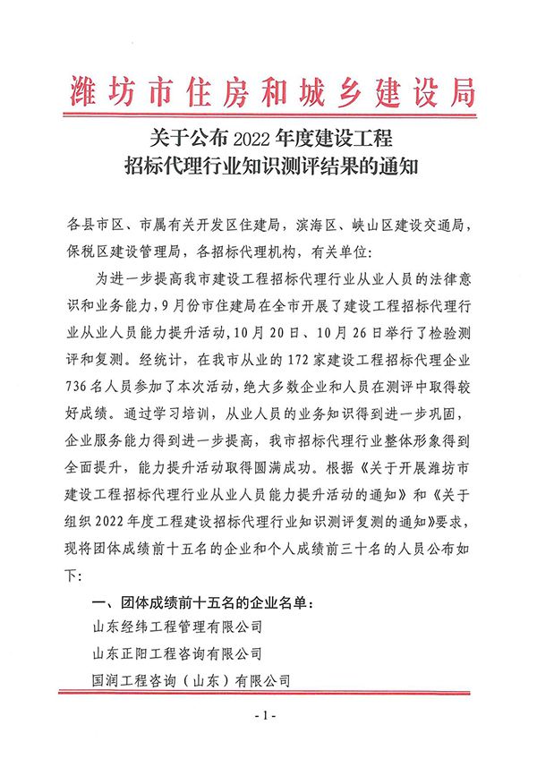 關(guān)于公布2022年度建設(shè)工程招標(biāo)代理行業(yè)知識測評結(jié)果的通知