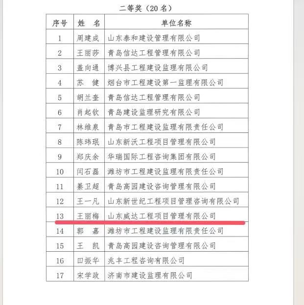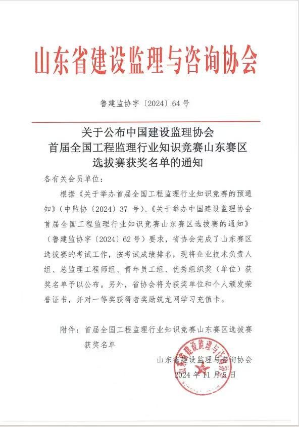2024年11月5日,山東省建設(shè)監(jiān)理與咨詢協(xié)會公布了“關(guān)于公布首屆全國工程監(jiān)理行業(yè)知識競賽山東賽區(qū)選拔賽獲獎名單的通知”,在此次選拔競賽中我公司取得佳績 。